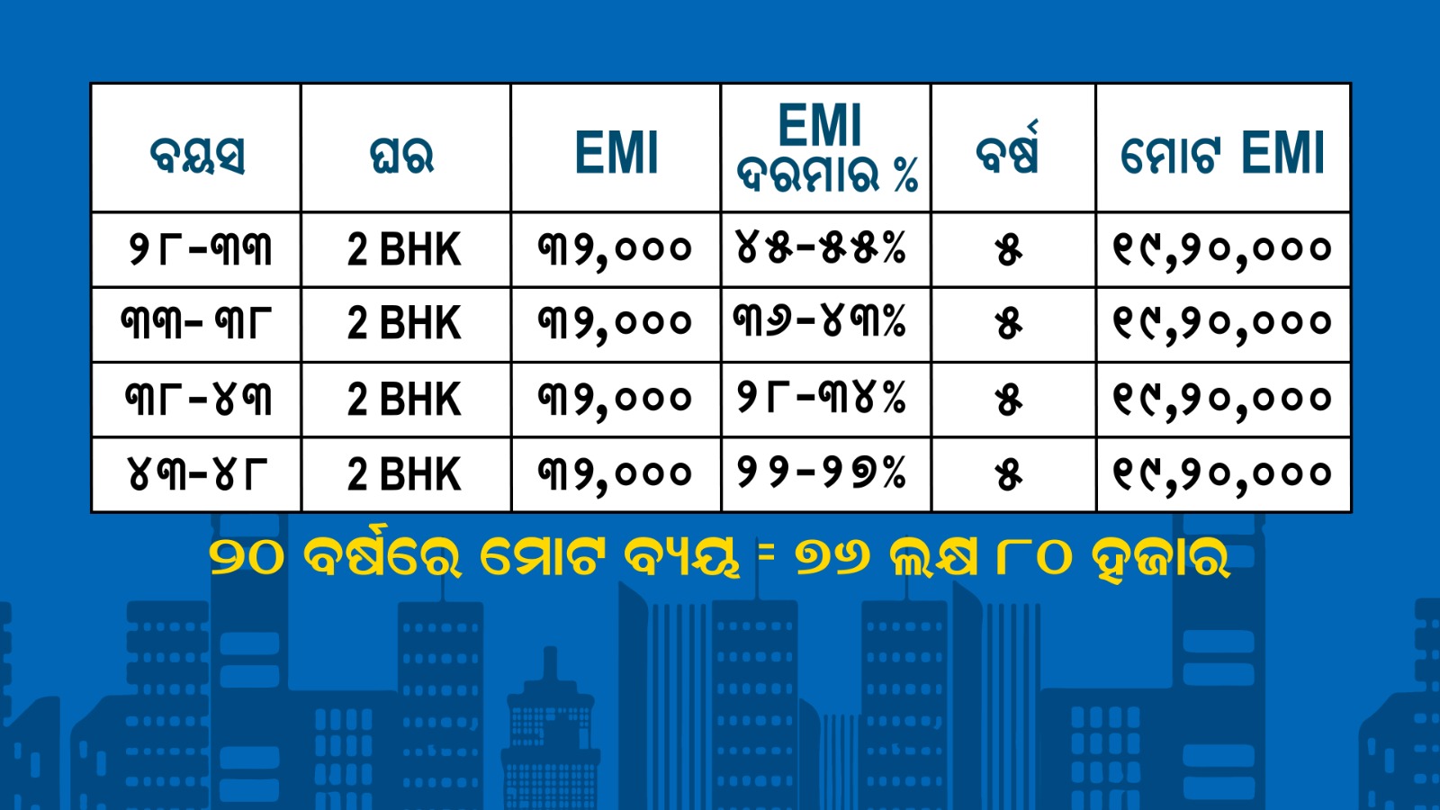 ଯଦି ବାର୍ଷିକ ପ୍ରତିଶତ ଲେଖାଏଁ ଇନକ୍ରିମେଣ୍ଟ ହୁଏ ତେବେ ୨୮ ବର୍ଷ ହେବାବେଳେକୁ ମଧୁସୁଦନଙ୍କ ଦରମା ୮୦ ହଜାର ଟଙ୍କା ହୋଇଯାଇଥିବ । ଏବେ ସେ ୪୨ ଲକ୍ଷ ଟଙ୍କାର ହୋମ ଲୋନ କରିପାରିବେ । ଯାହାର ଅବଧି ୨୦ ବର୍ଷ ହୋଇଥିବାବେଳେ ସୁଧହାର ରହିବ ୮ ପ୍ରତିଶତ । ମଧୁସୁଦନ ରହୁଥିବା ଅଞ୍ଚଳରେ ଏକ ଟୁ ବିଏଚକେ ଆପାର୍ଟମେଣ୍ଟର ଦାମ ପ୍ରାୟ ୮୦ରୁ ୯୦ ଲକ୍ଷ ଟଙ୍କା । ଏଥିପାଇଁ ୨୦ ଲକ୍ଷ ଟଙ୍କାର ଡାଉନପେମେଣ୍ଟ ସହ ଅବଶିଷ୍ଟ ୫୫-୬୫ ଲକ୍ଷ ଟଙ୍କା ହୋମଲୋନ କରିବାକୁ ହେବ । ଯାହାକି ମଧୁସୁଦନ ବାବୁଙ୍କ ବଜେଟ ବାହାରେ । ଏଣୁ ସେ ଚନ୍ଦ୍ରଶେଖରପୁରକୁ ଛାଡି କଳିଙ୍ଗ ନଗର ଅଞ୍ଚଳରେ ଘର ଦେଖିବେ । ସେଠାରେ ଟୁ ବିଏଚକେ ଆପାର୍ଟମେଣ୍ଟର ଦାମ ପ୍ରାୟ ୪୦-୫୦ ଲକ୍ଷ ଟଙ୍କା । ଏଥିପାଇଁ ୩୮ ଲକ୍ଷ ଟଙ୍କାର ଲୋନ କରିବେ । ଏବଂ ୨୦ ବର୍ଷ ଯାଏଁ ମାସିକ ୩୨ ହଜାର ଟଙ୍କା ଇଏମଆଇ ଦାଖଲ କରିବେ । ଏବେ ଆସନ୍ତୁ ହିସାବ କରିବା ଘର କିଣିବା ପରେ ମଧୁସୁଦନଙ୍କ ଖର୍ଚ୍ଚ କେତେ ହେଉଛି…